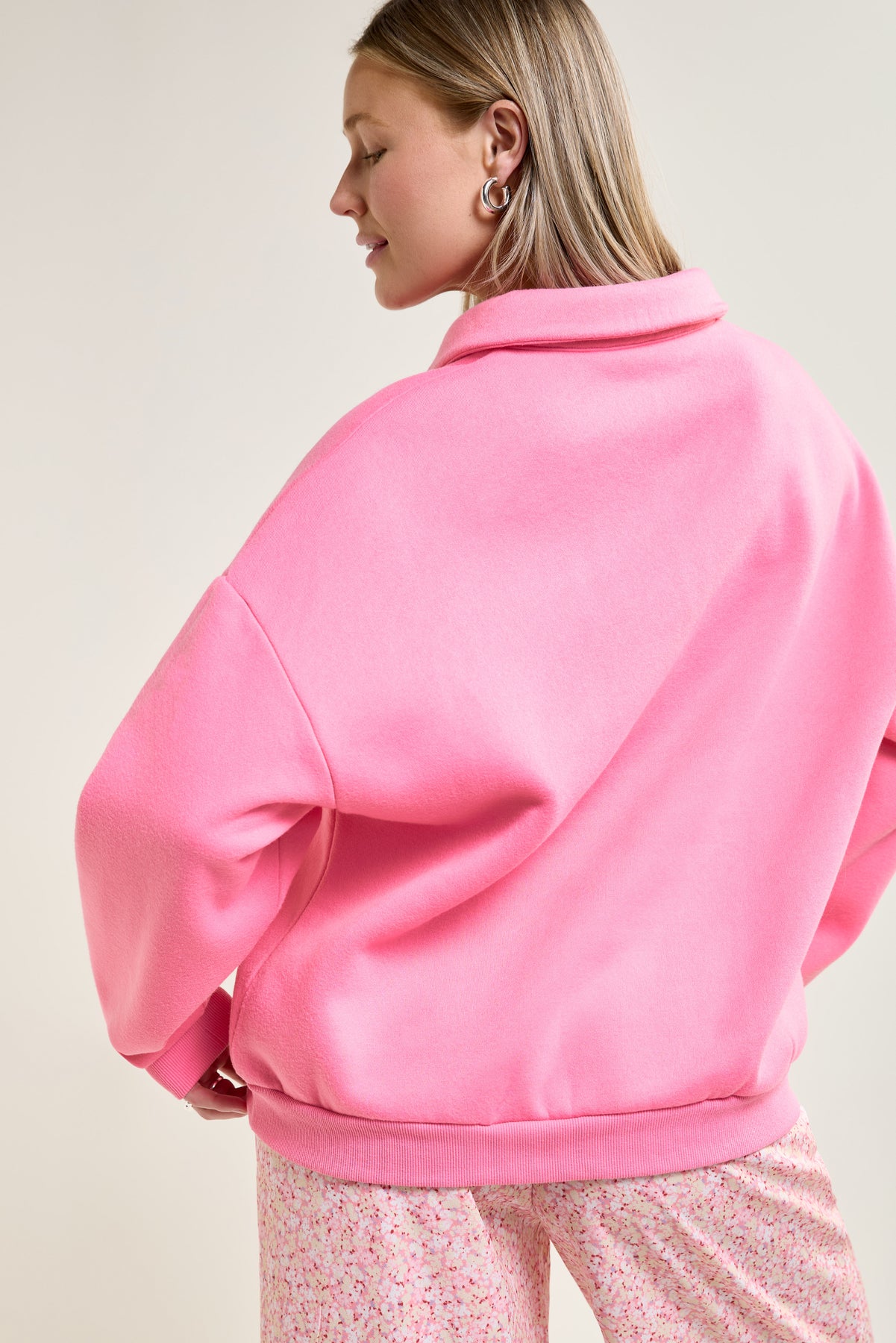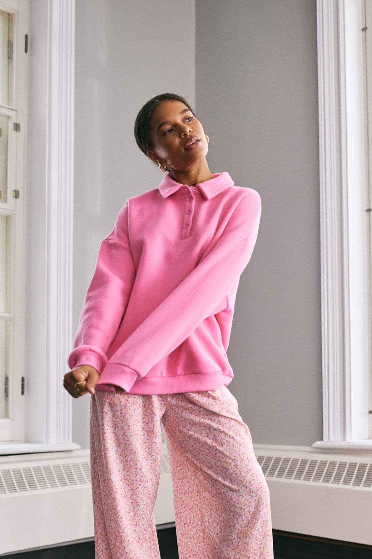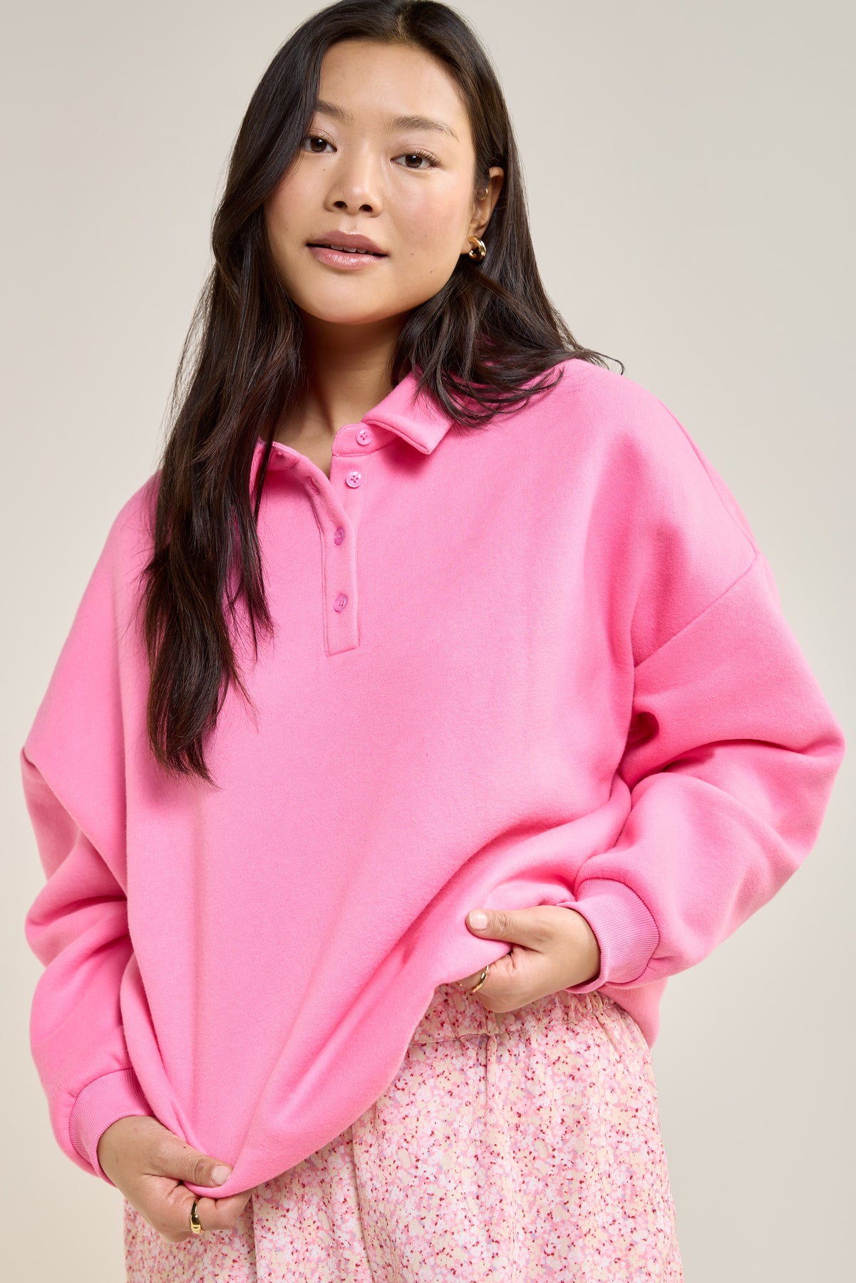 Ce chandail en molleton ultra-confortable revisite le style classique avec sa coupe ample et son col polo boutonné, parfait à agencer avec un pantalon fluide ou encore avec un jeans.