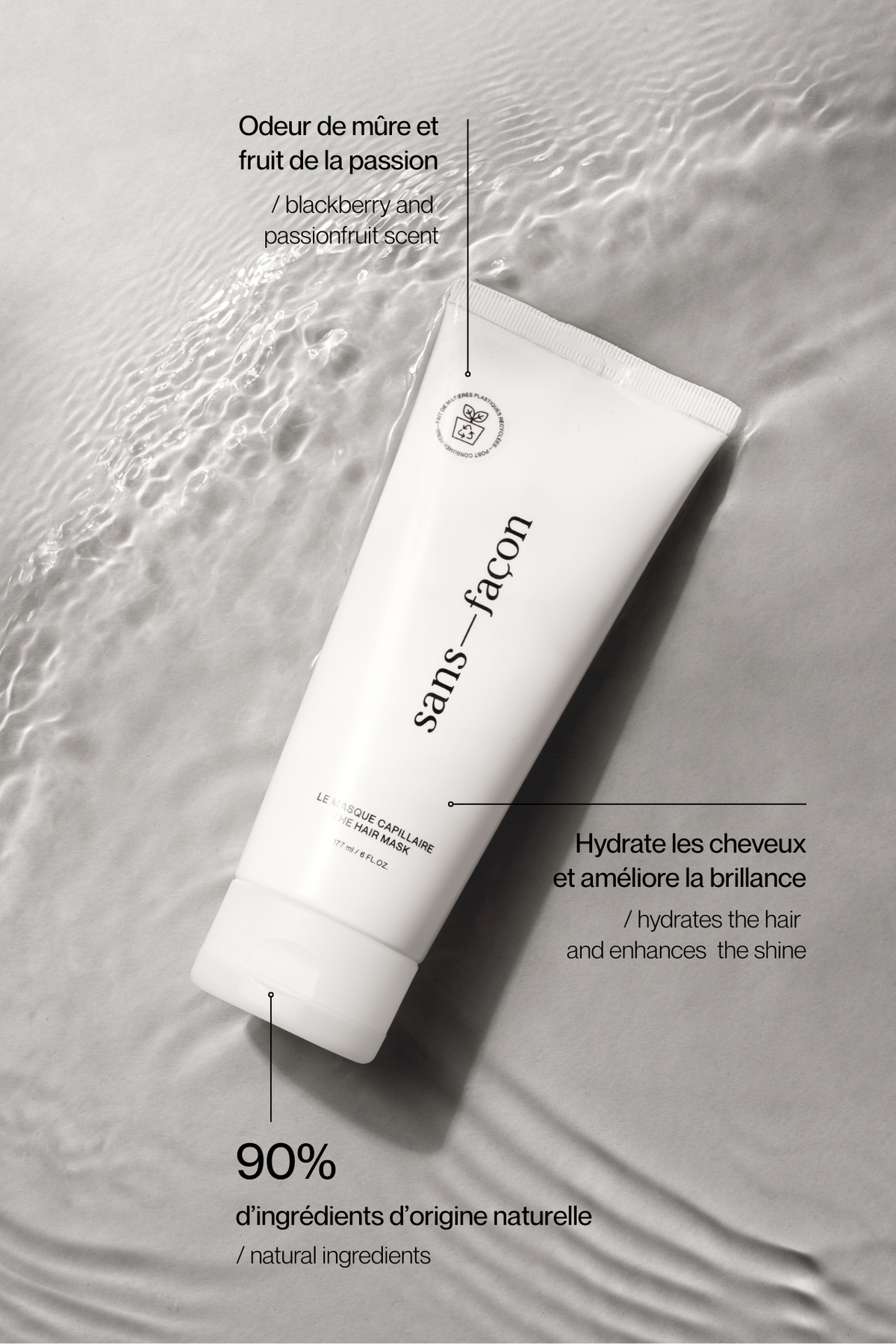 Grâce à son mélange unique d’ingrédients, le masque capillaire redensifie votre chevelure pour un épaississement de la tige du cheveu et davantage de corps pour une chevelure plus volumineuse. Il répare, améliore la douceur, la résistance et la brillance des cheveux. Il est conçu pour hydrater en profondeur et laisser votre chevelure douce et souple. Ce produit avec plus de 90% d'ingrédients d'origine naturelle va devenir un incontournable, en plus d'être complémentaire à notre huile à cheveux! Vous ne pourrez plus vous passer de ce duo, l’essayer c’est l’adopter pour une chevelure en bonne santé. Odeur de fruit de la passion et mûre.