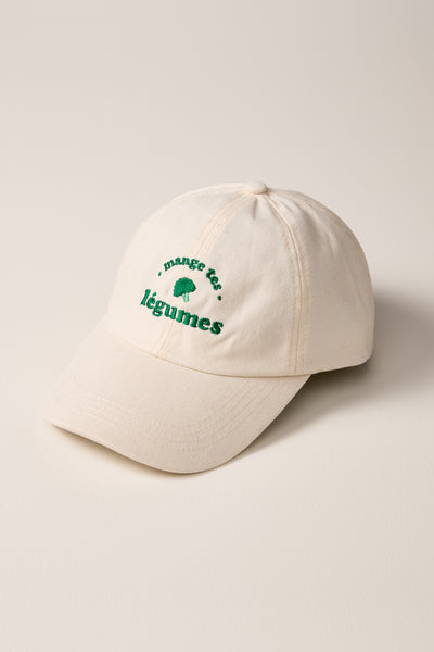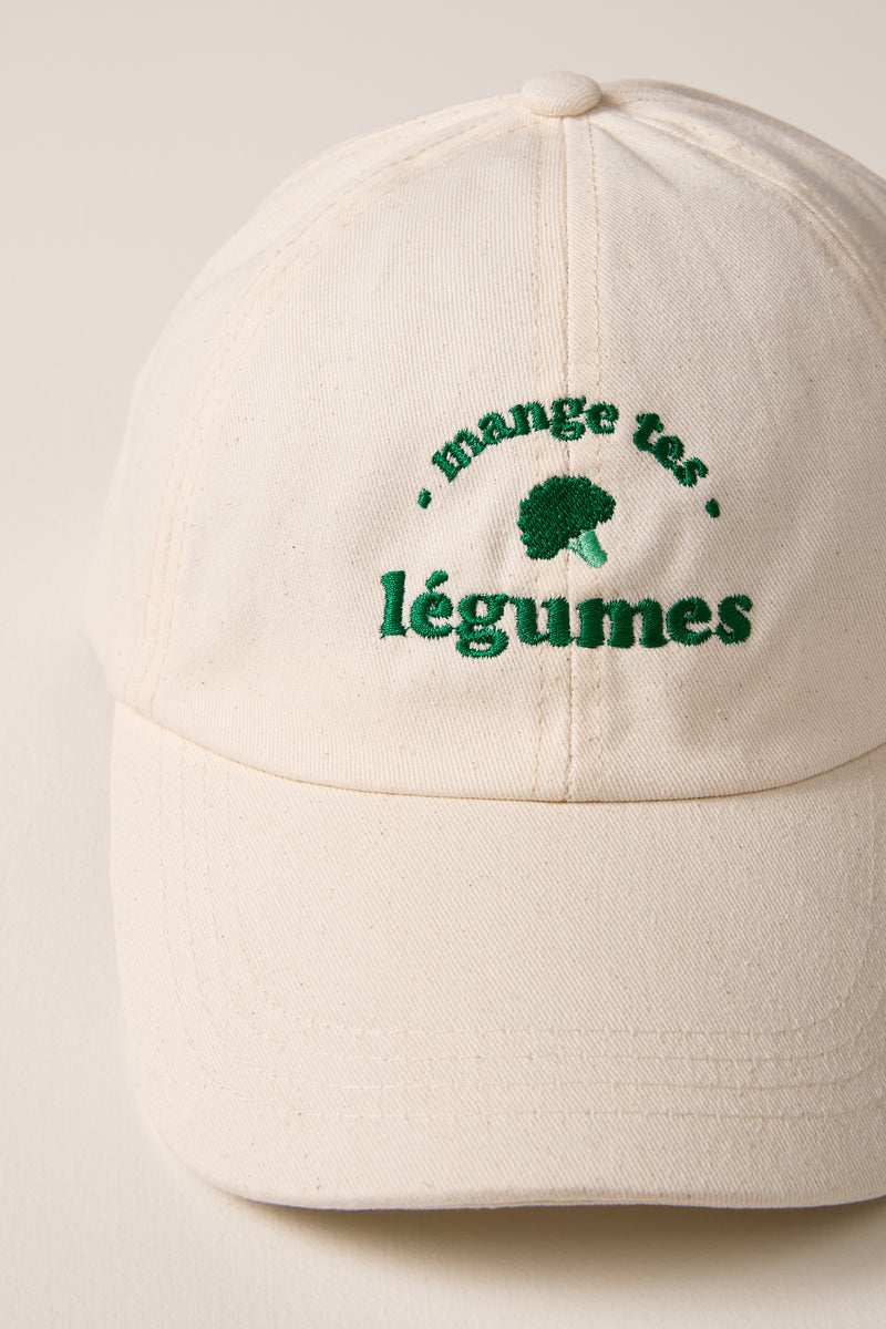 - Beige cap with green “Mange tes légumes” embroidery on the front