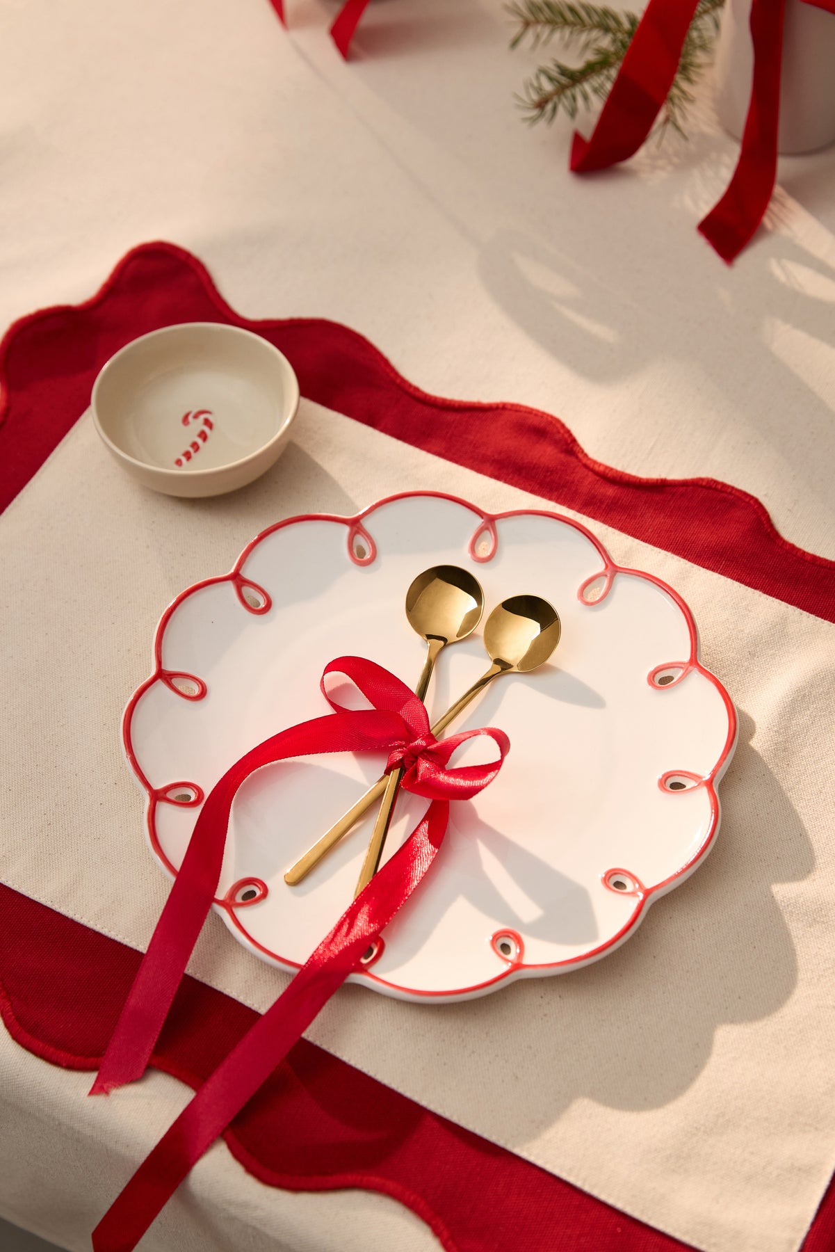 Add an elegant and refined touch to your dinner table with this red scalloped-edge placemat.