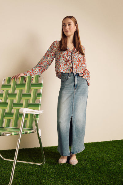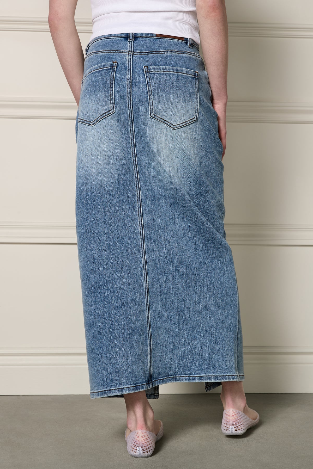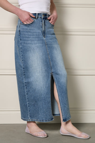 This skirt is perfect for the transitional season and is one of our favorites! Comfortable, stretchy and feminine!