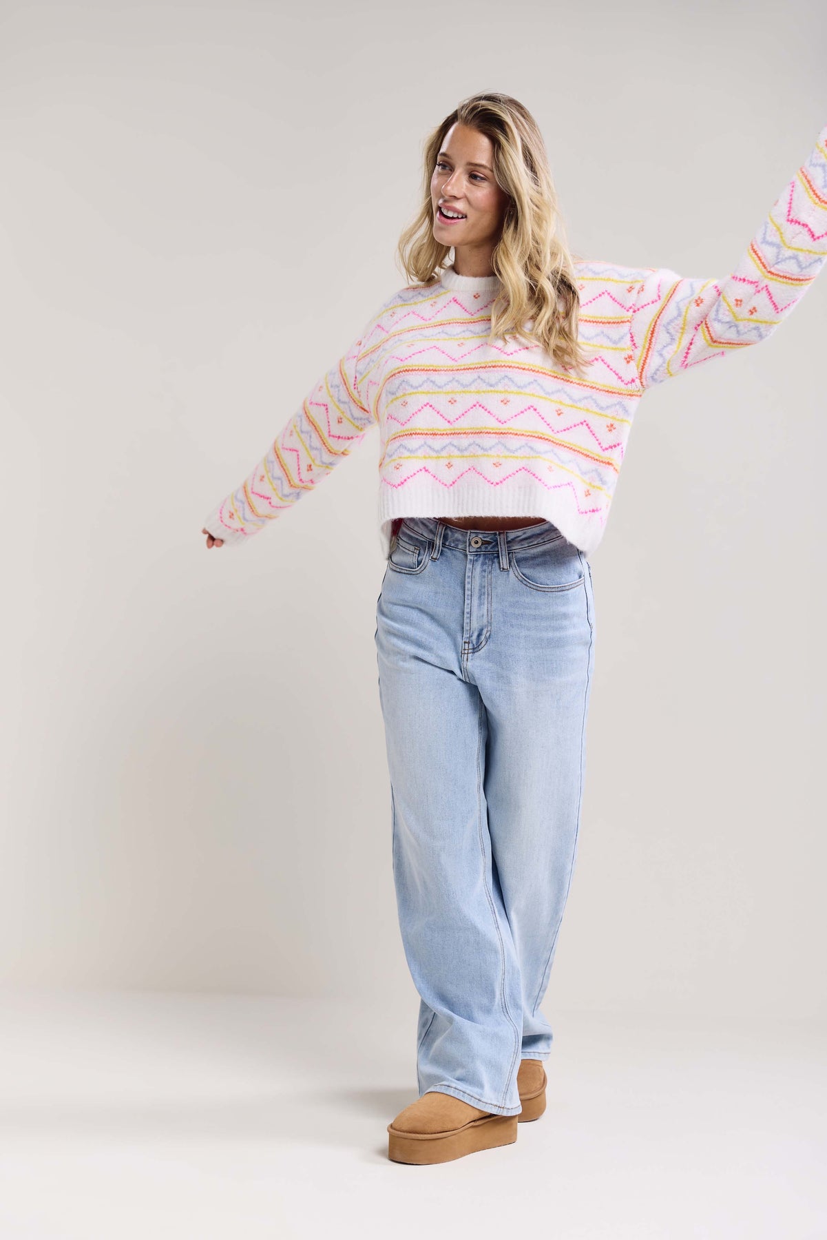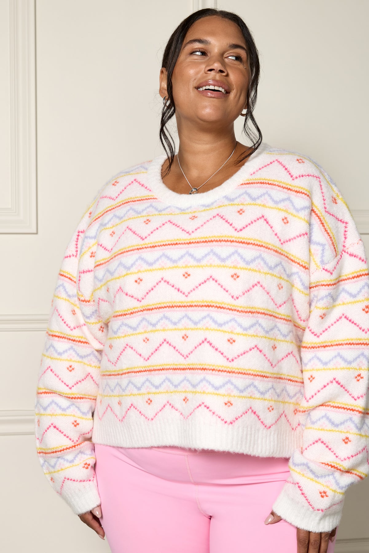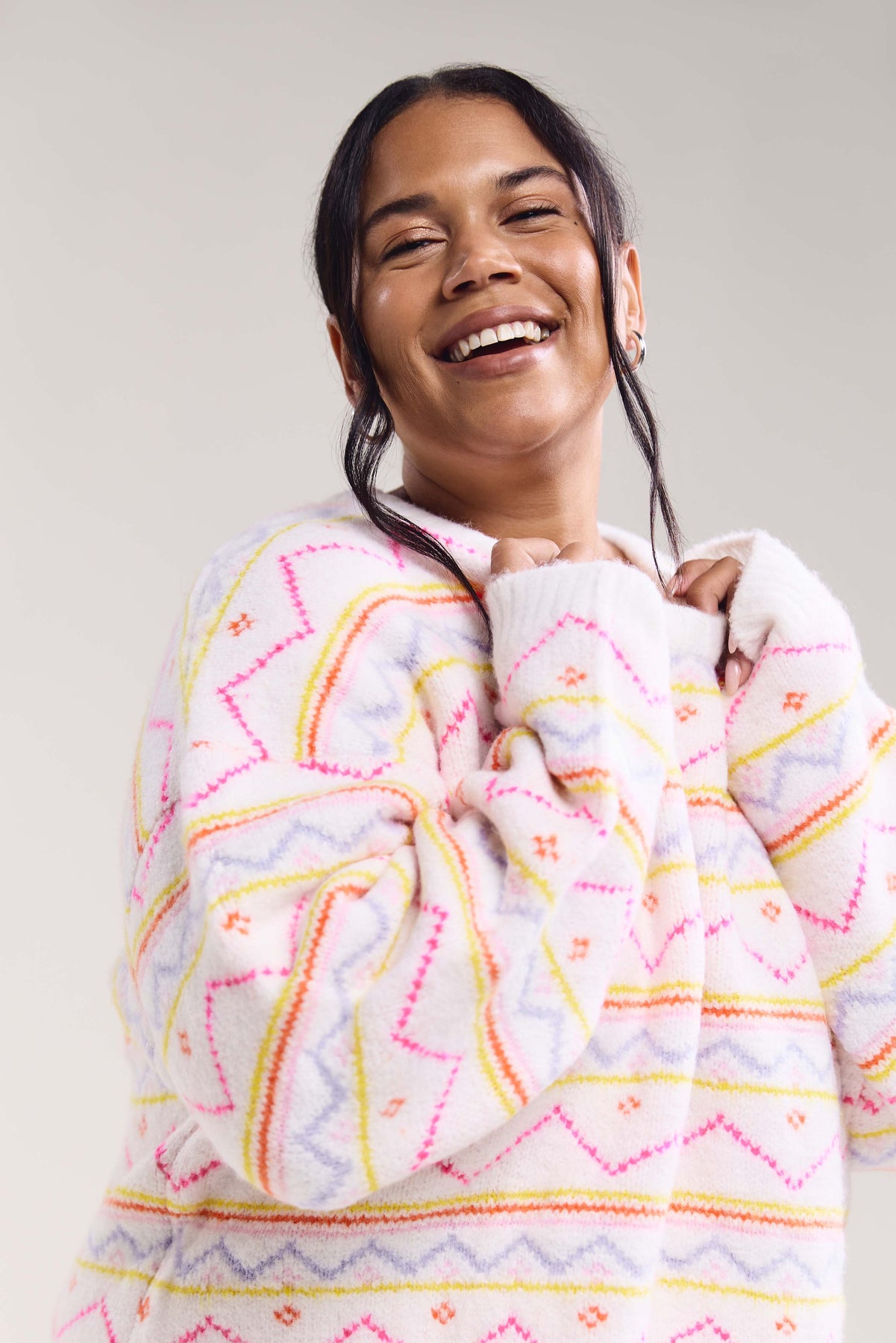 Loose-fitting jacquard knit sweater adorned with a unique graphic pattern. Its soft, heavyweight knit wraps you in comfort and style.