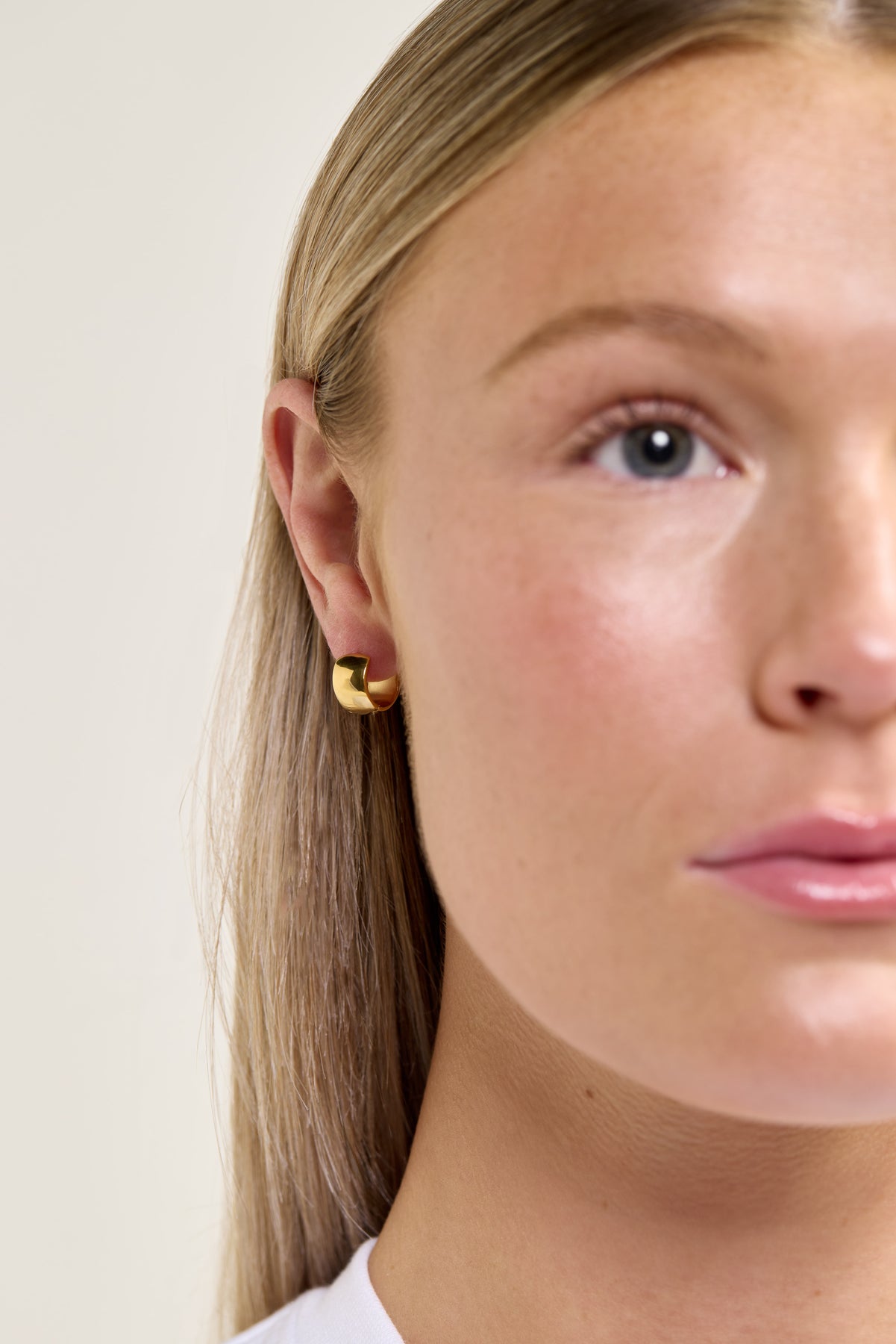 Les boucles d'oreilles Rafaelle se distinguent par leur anneau large qui épouse parfaitement le lobe pour un éclat moderne. Portez-les avec un col roulé noir pour un contraste saisissant ou avec un chignon haut pour affirmer votre style.