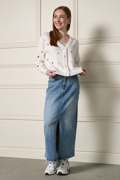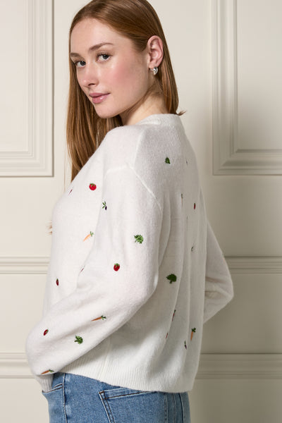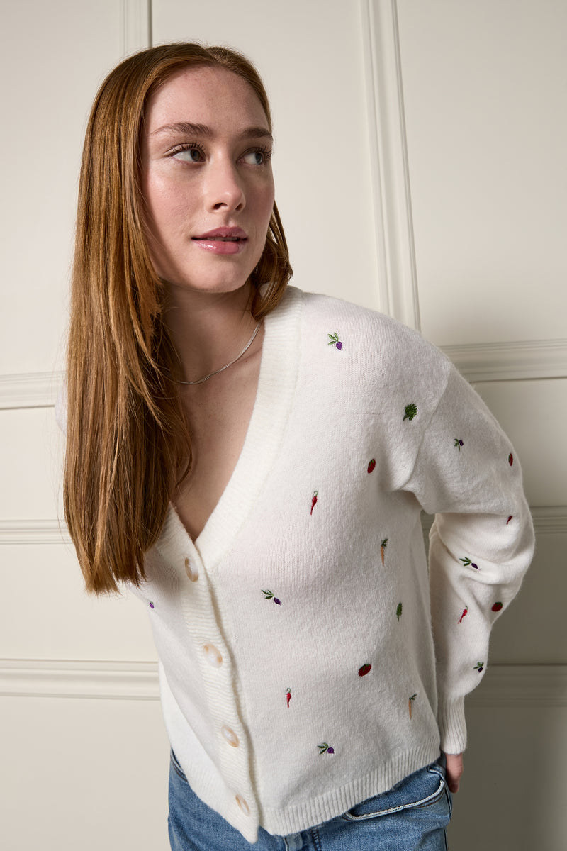 Ce cardigan en tricot léger est un coup de cœur de l'équipe. Ses petites broderies de légumes vous charmerons.