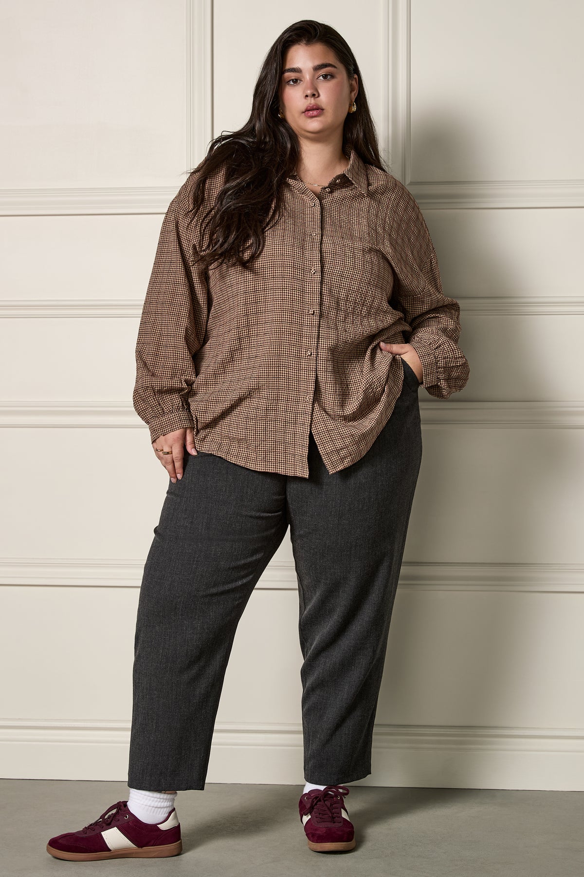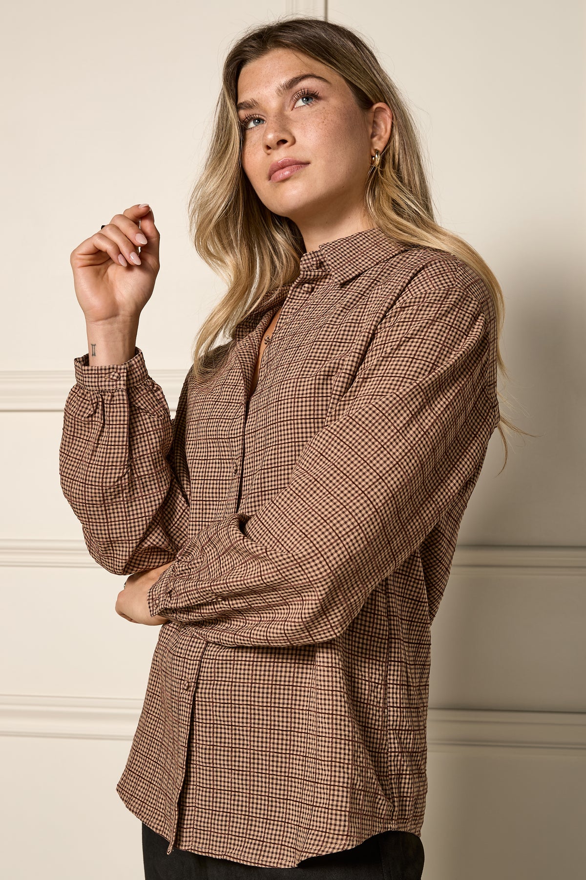 Cette chemise ample à carreaux est le morceau parfait pour transitionner vers l'automne. Son look chaleureux et son tissu léger la rendent parfaite pour cette saison !