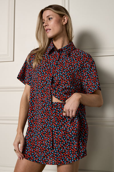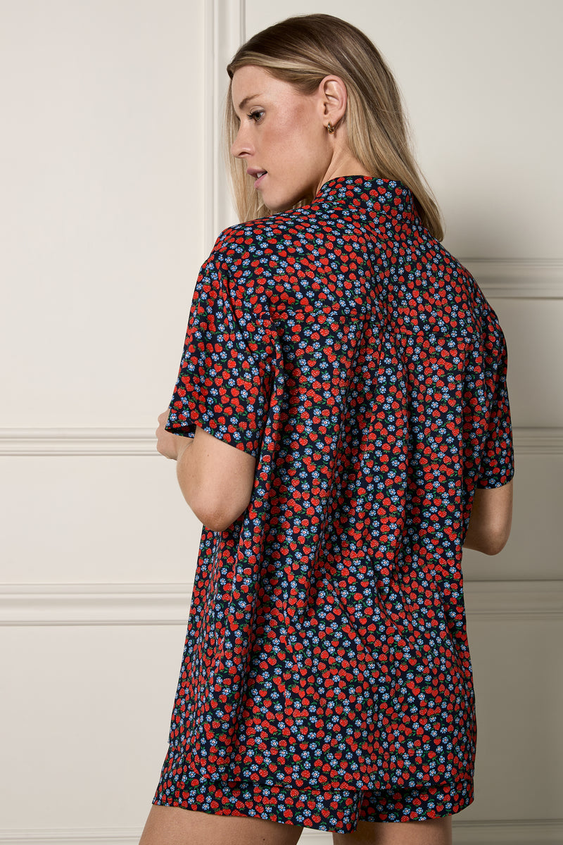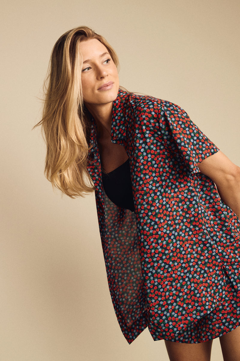 Cette chemise à manches courtes est fluide et confortable. Ses motifs de petites fraises et fleurs bleues la rendent féminine et délicate. Parfaite pour vous accompagner pendant tout l'été!