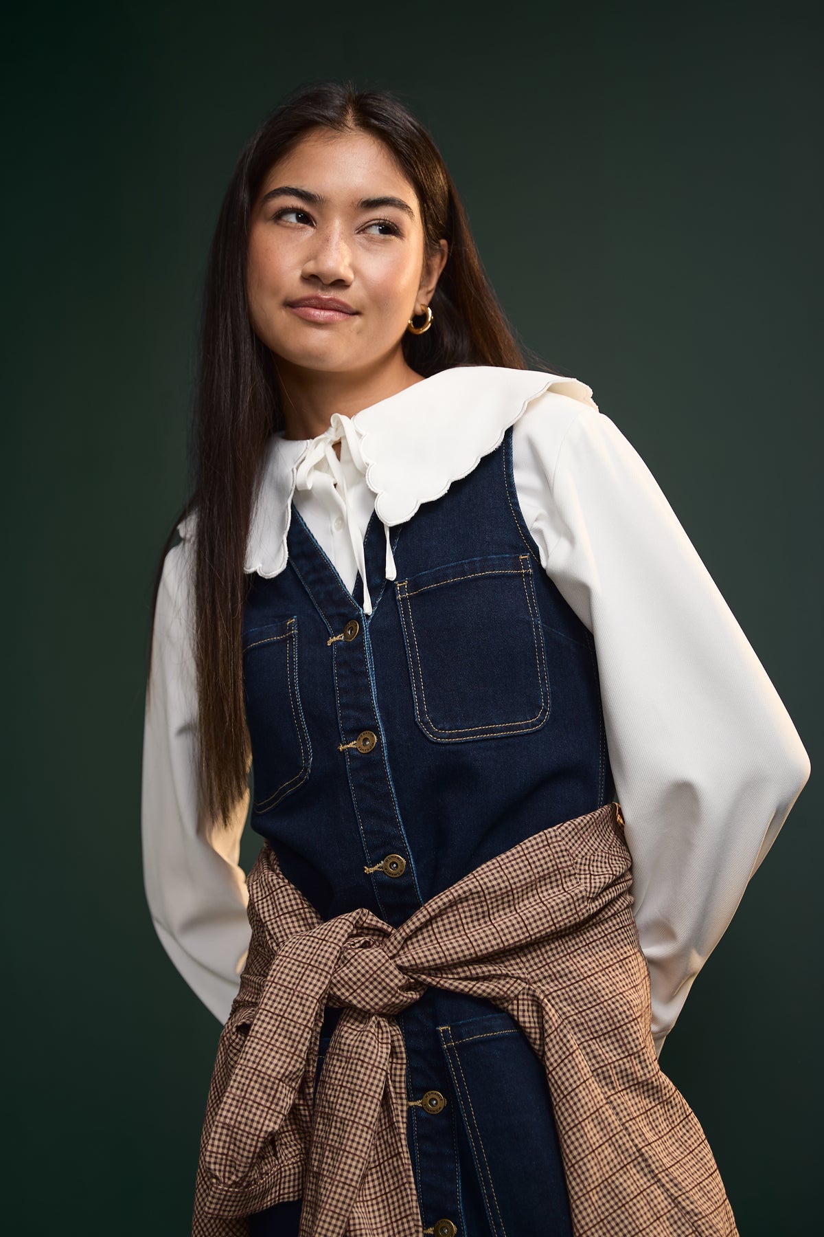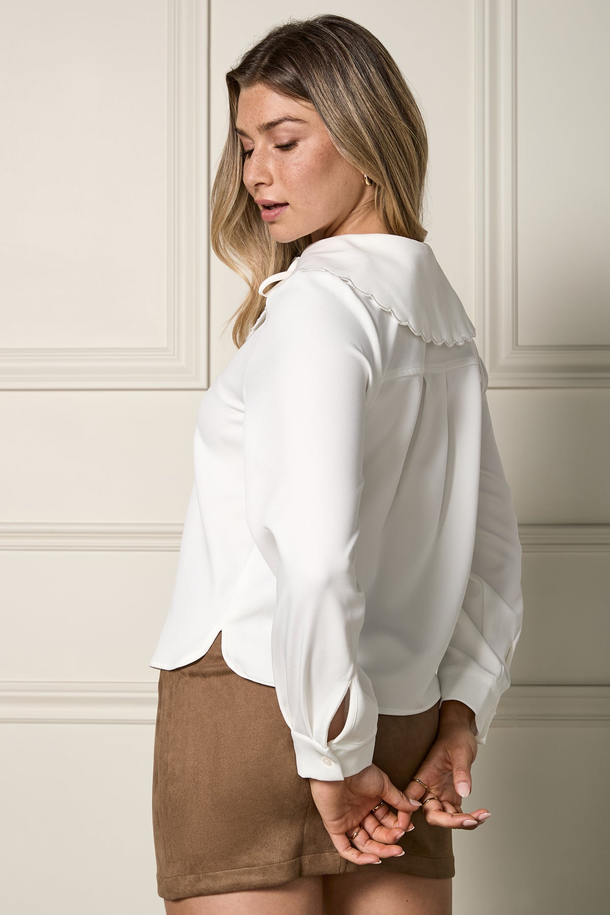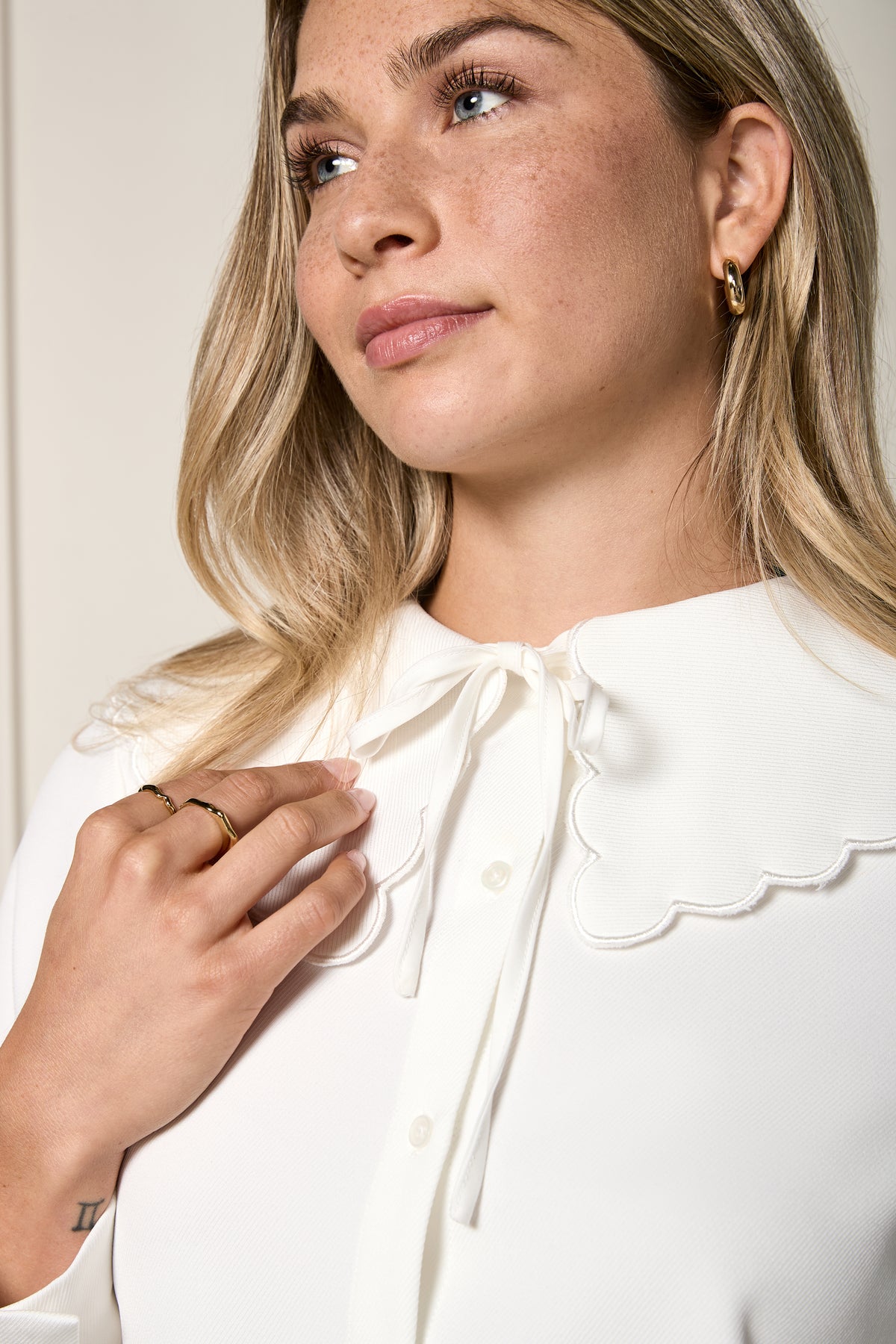Une chemise élégante avec un col claudine et un joli cordon à nouer, parfaite pour ajouter une touche féminine et raffinée à vos tenues du quotidien.
